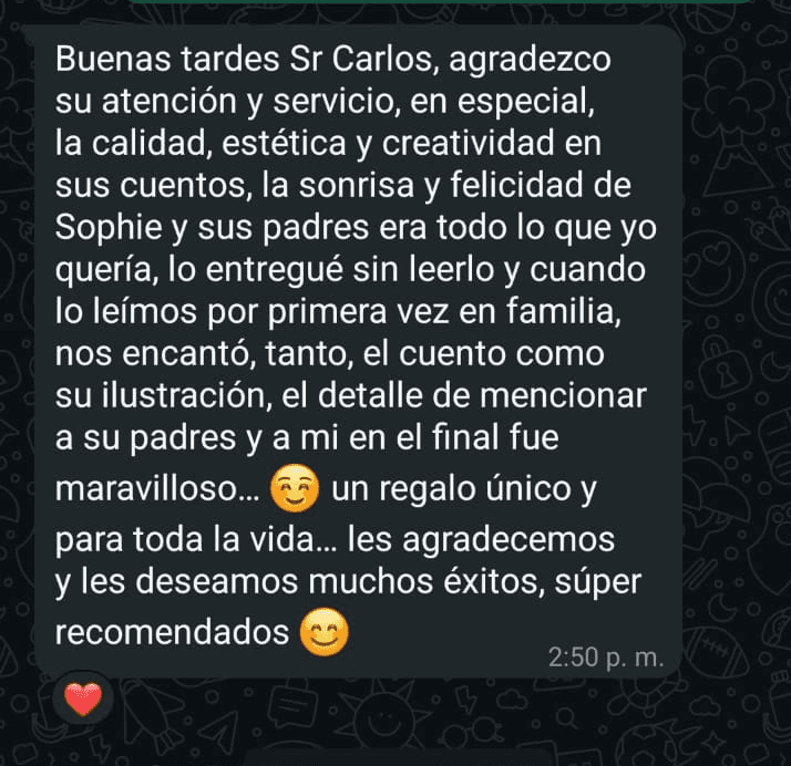 Descripción: Cuento 100% personalizado con nombre, apariencia e historia única basada en lo que el cliente desea. Puede incluir imagen o foto.