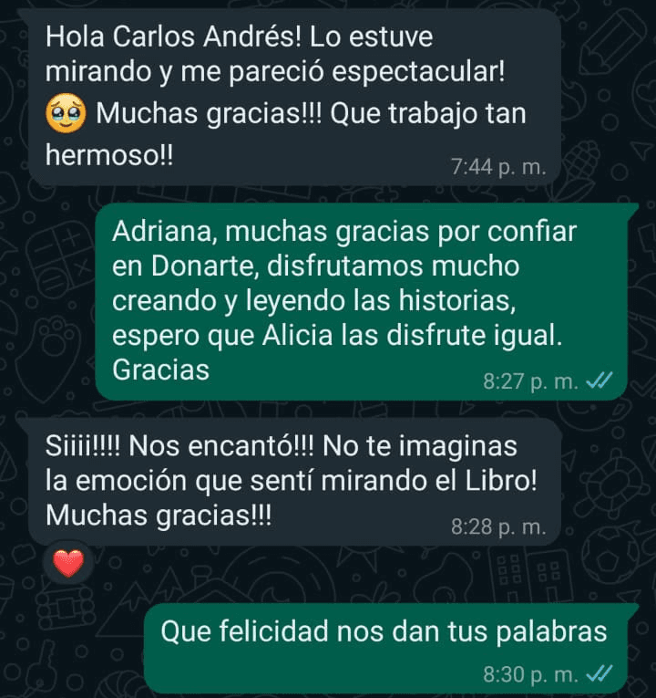 En Donarte trabajamos con escritores y diseñadores maravillosos, que han creado cientos de historias llenas de magia, que hacen que cada página sea un tesoro. Por eso, casi siempre nuestros clientes confían y dejan que la sorpresa llegue al recibir el libro. Pero, si prefieres dar tu visto bueno antes de imprimir, puedes agregar nuestro Plan de Revisión, con un valor adicional de $40.000 COP. Este servicio está disponible para las categorías Cofre de la Imaginación, Multicuento Espejo Mágico y Espejo Mágico.